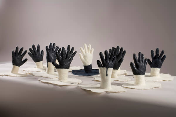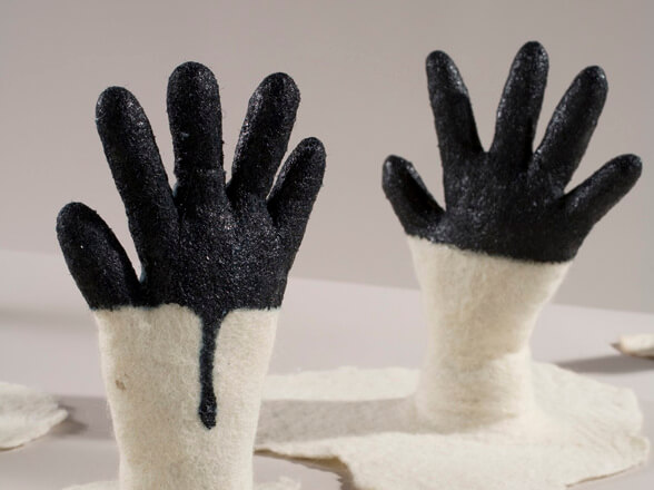 Il feltro si presta a farci lavori tridimensionali, si modella e ‘scolpisce’ ma a differenza delle materie tradizionali è caldo e morbido. E poi si lega ad altri materiali, igloba oggetti e tessuti con facilità. Ci sono forme tradizionali (quelle dell’Asia centrale ad esempio) e possibilità da esplorare. Il materiale può indurre a trovare delle forme, ha le sue forme codificate. Si possono accettare o rifiutare, adottare o stravolgere.
