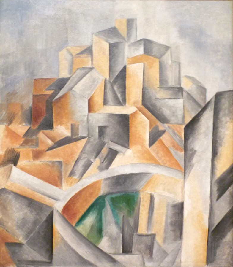 Case e alberi, fa parte di una serie di dipinti, di piccolo formato, realizzati da Braque a L’Estaque, durante un viaggio nei luoghi di Cézanne (morto da poco, nel 1906). In questa serie di quadretti c’è una rilettura degli insegnamenti di Cézanne in una chiave drammaticamente formalizzata. La formalizzazione è geometrica, la sensazione visiva si è persa. Proprio per questo si chiamerà Cubismo. Non più linee delicate e curve ma cubi, la realtà rappresentata diventa un parallelo di quella osservata.