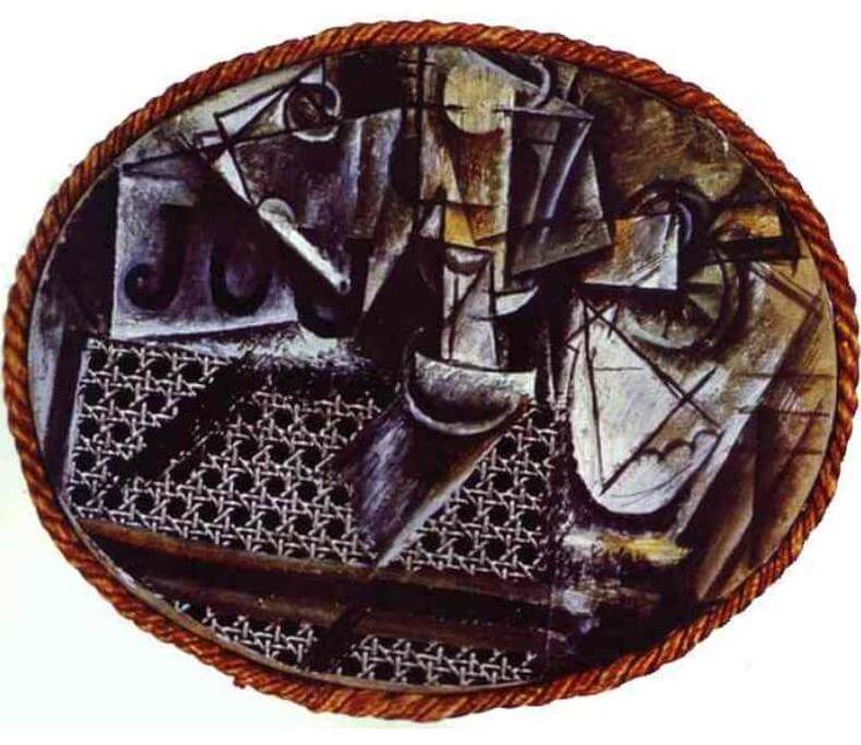 Picasso, sempre all’avanguardia, coglie il clima subito precedente allo scoppio della guerra e inizia a creare opere “oggetti”, nature morte in cui compaiono frammenti di giornale, scritte ed elementi non comuni.